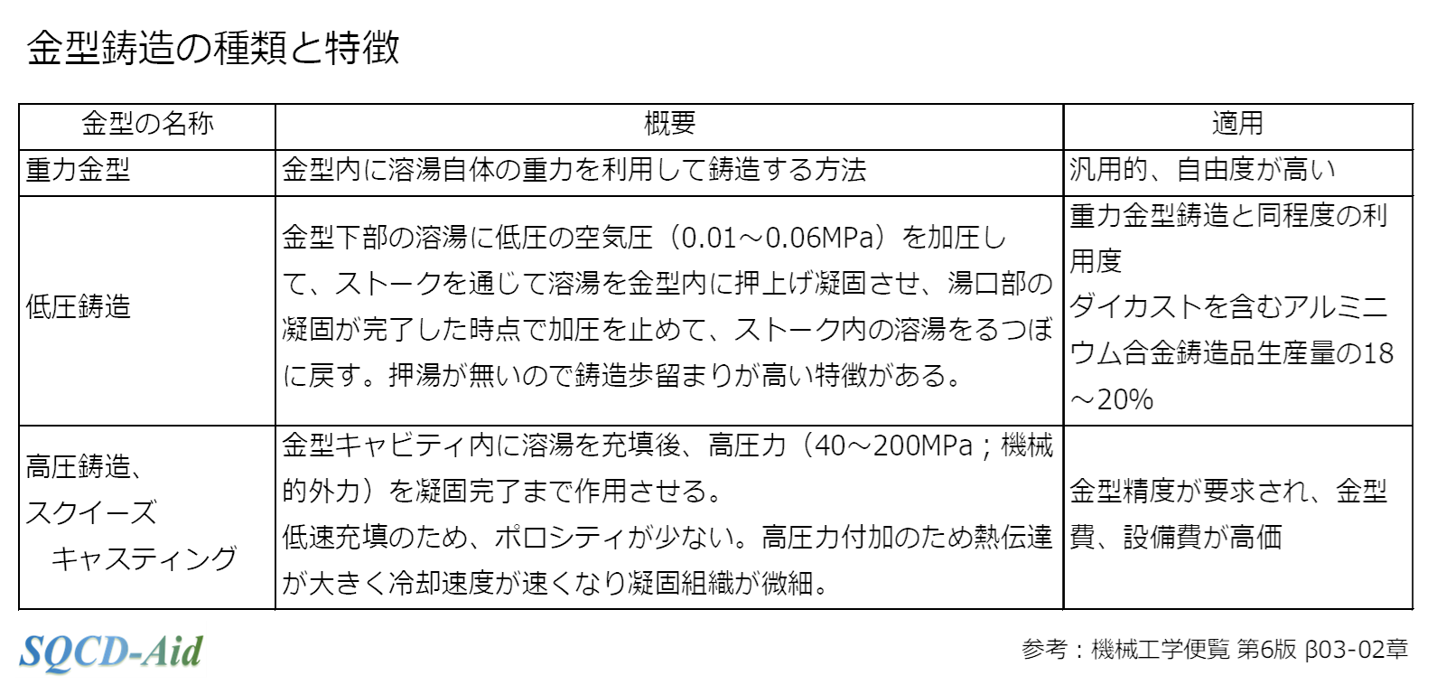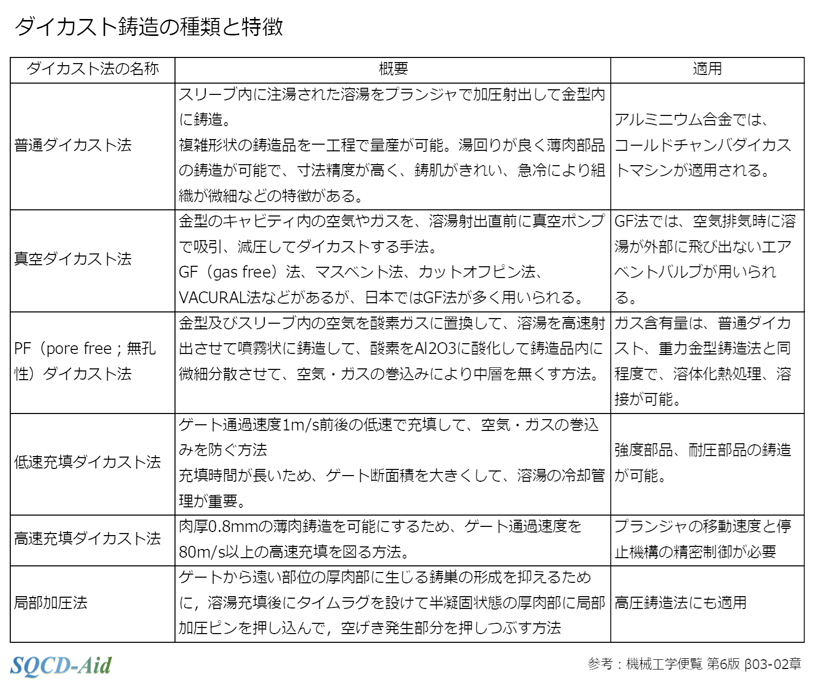 表5ダイカスト鋳造の種類と特徴 出典_参考:機械工学便覧 第6版 β03-02章