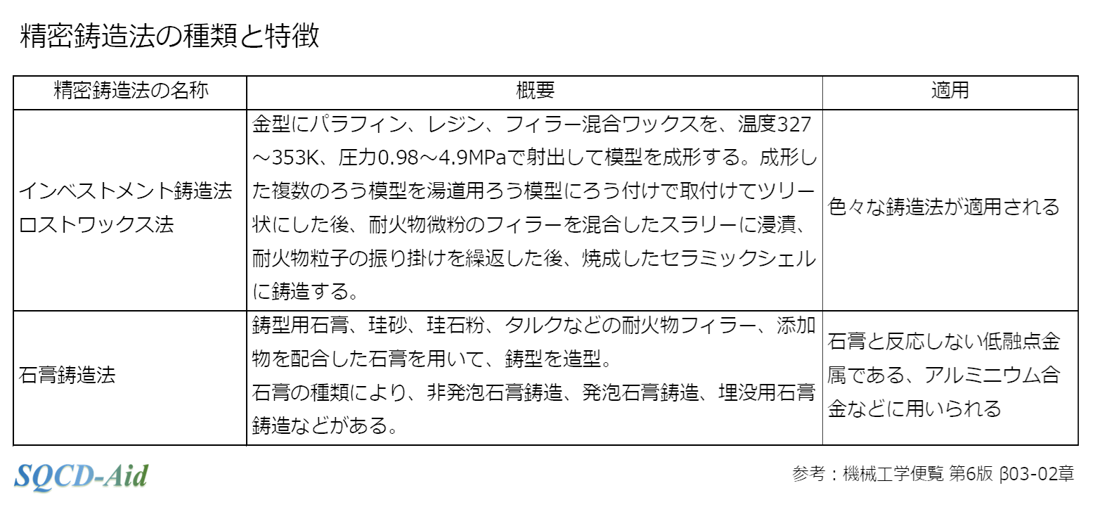 表7精密鋳造法の種類と特徴 出典_参考:機械工学便覧 第6版 β03-02章
