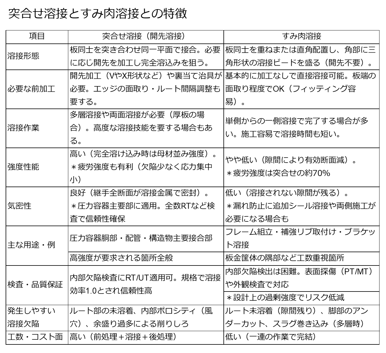 以下の表に、突合せ溶接とすみ肉溶接との特徴を、設計・生産技術上の観点から比較します。