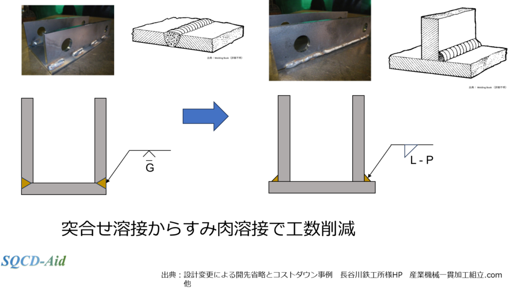 開先突合せ溶接を伴う構造を、すみ肉溶接主体の構造に変更した事例を紹介します。以下の図は、ある板金製品で複数の鋼板を組み合わせる際の改善例1)です。