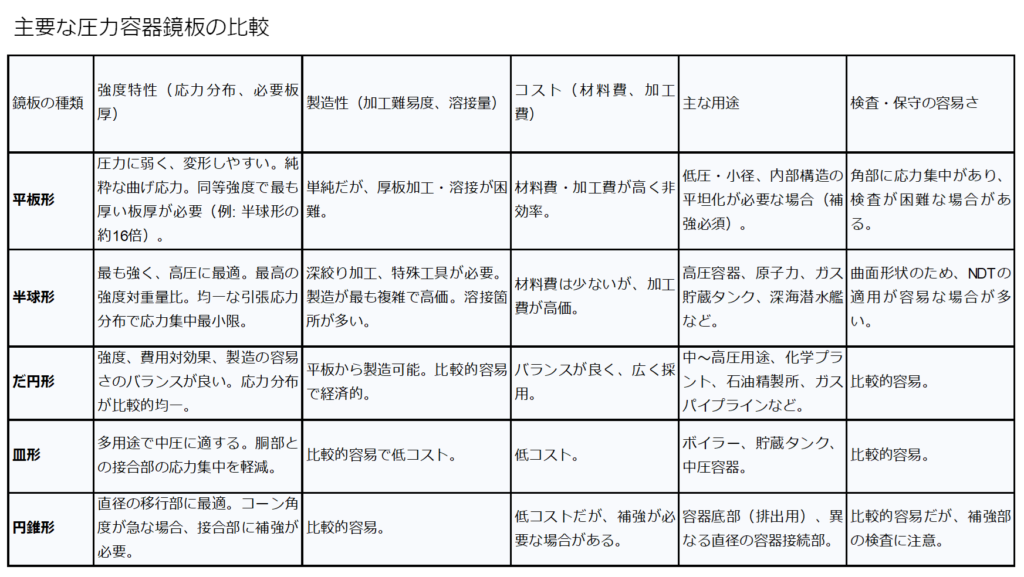 以下に示す表は、主として技術者が、設計、生産技術、品質管理などの実務において鏡板の選定や評価を行う際に、それぞれの形式の特性を比較できるようにしています。鏡板の選択は、強度、コスト、製造性、運用条件、検査性など、多岐にわたる要因に影響される複雑な意思決定です。