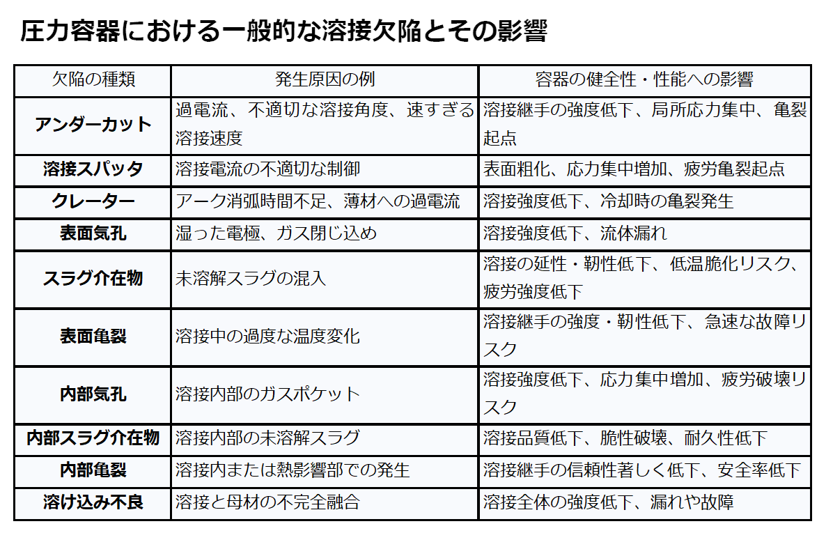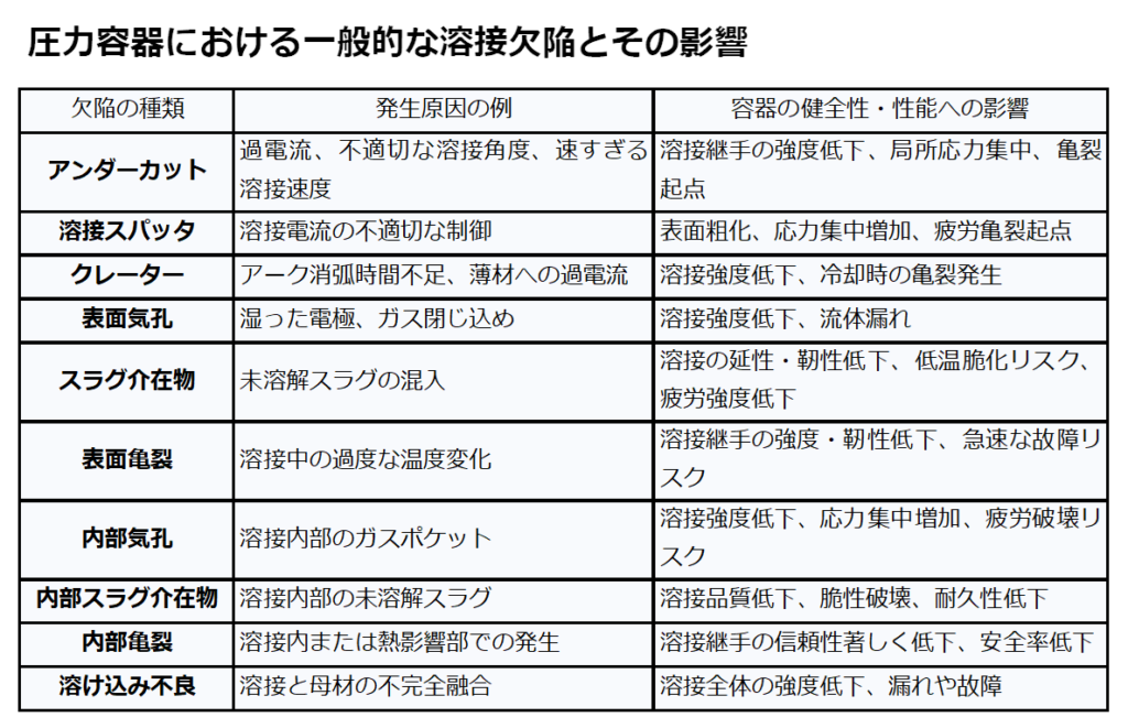 表 圧力容器における一般的な溶接欠陥とその影響 出典:Gemini Deep Reserch