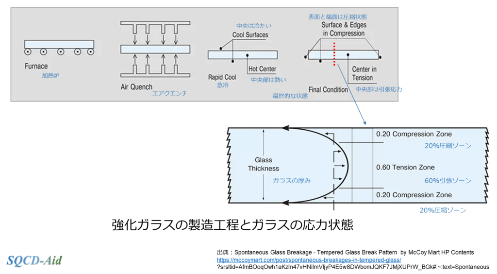 図 強化ガラスの製造工程とガラスの応力状態 出典:Spontaneous Glass Breakage – Tempered Glass Break Pattern by McCoy Mart HP Contents
