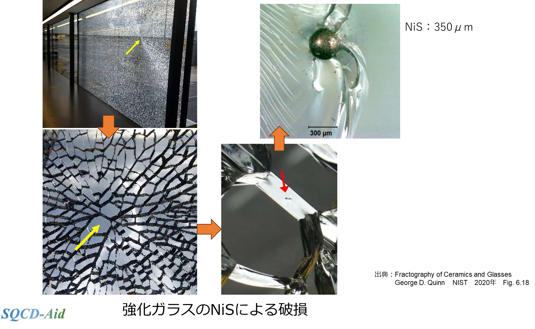 NiS起因の破壊が発生すると、破壊起点にはNiS粒子自体が黒い小点(ストーン)として残っていることが多く、直径0.1〜0.2 mm程度の球状の粒子が確認されることがあります。