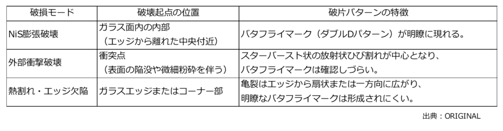 ・ 鑑別:施工不良による破壊は、割れ始めがエッジや穴開け部になりやすく、典型的なバタフライマークは現れない可能性が高いです。これに対し、NiS起因の破損は、通常、ガラス面中央付近を起点とするバタフライマークを伴います。