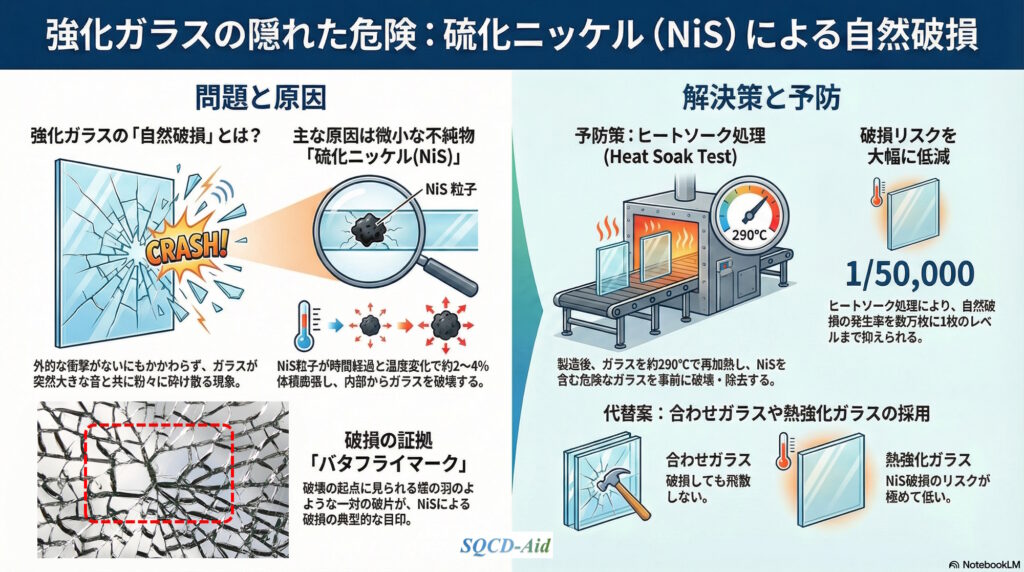 NiSインクルージョン(介在物)による自然破損のリスクとそれに伴うコスト(交換費用、負傷リスク)を低減するために、業界では様々な対策が講じられています。