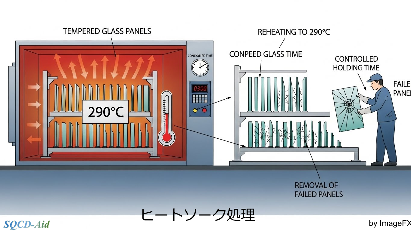 強化ガラスを完成させた後、NiSの相転移温度(約380℃)より低い、約290±10℃(または260±10℃)の高温槽に再加熱し、設定された時間(欧州規格prEN 14179では最低2時間)保持し、その後制御しながら冷却します。