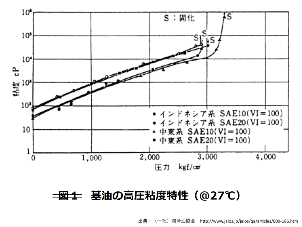 図5.3.1.7 鉱油系潤滑油の圧力-粘度特性の例 (一社)潤滑油協会HP