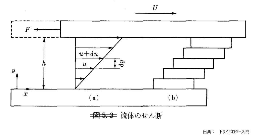 図5.3.1.1は流体内部で、高さ方向の速度変化が一様な例ですが、実際の局面では、二面が曲面であったり、流体内に圧力差があったりして、流速の変化が一様でないことがあり、二面間の流れを一般化して、微小厚さ\( dy \)の層について上下面の速度差が\( du \)であるとき、単位面積あたりのせん断抵抗力はせん断応力になるので、この値をτとすると、