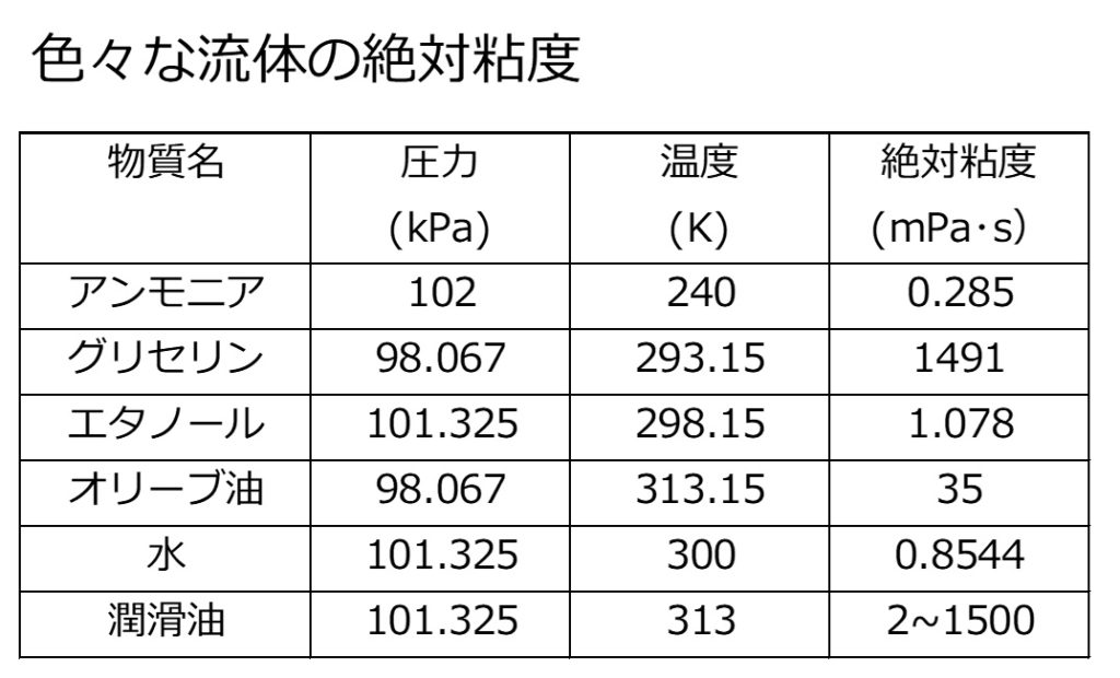 粘度には、流体の運動状態から導かれる絶対粘度と、密度との関係を考慮した動粘度の2種類の粘度を考えることが多いです。