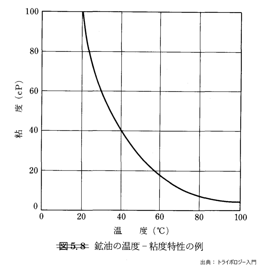 潤滑油の粘度は、一般に温度により大きく変化します。図5.3.1.6に鉱物油の温度-粘度特性の一例を示します。