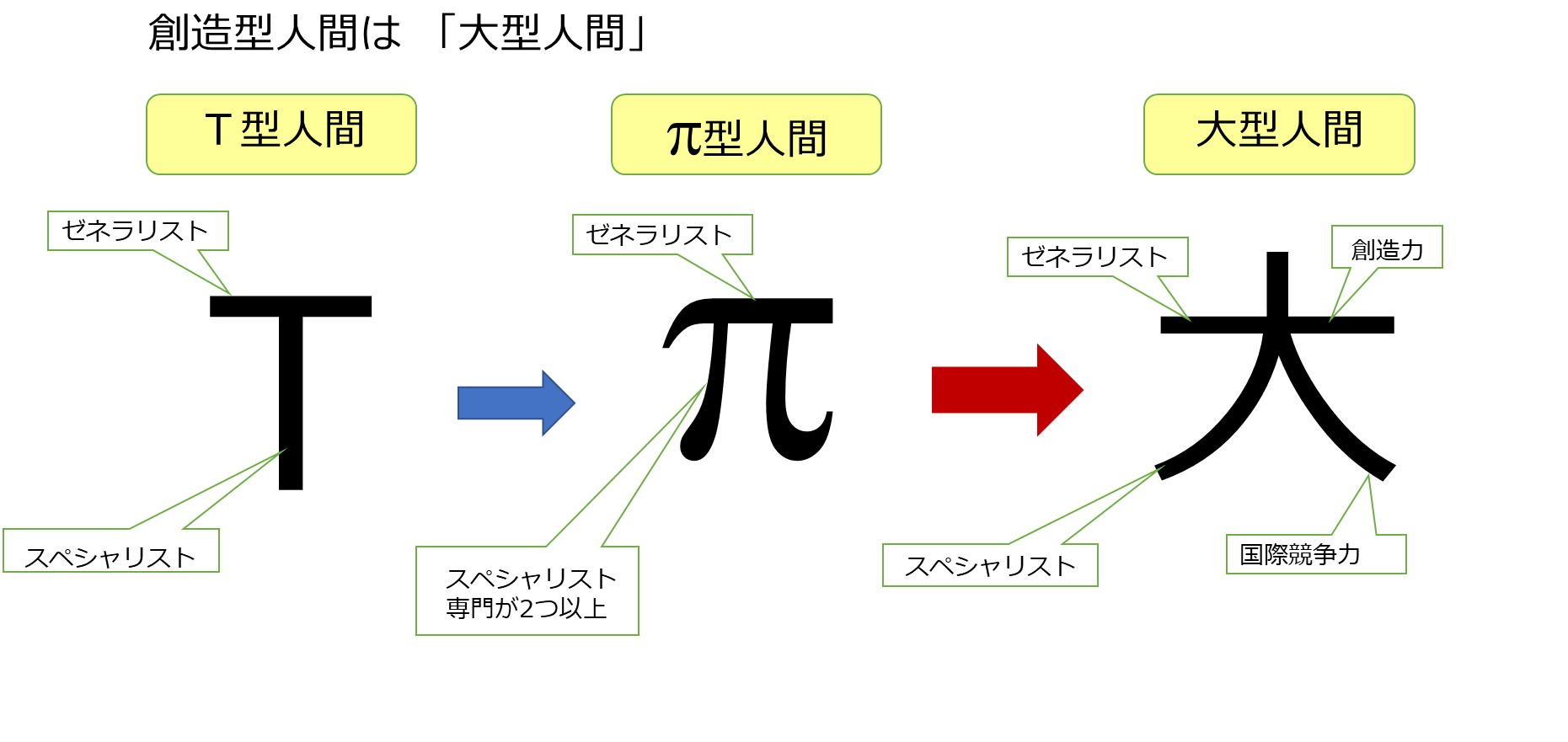 期待される人物としてよく言われるのは「T型人間」だと言われています。これは、ゼネラリストとして幅広い見識を持ち、さらにスペシャリストとしての独自の専門分野に精通している人をいいます。また、これだけでは不足で、これからは専門分野を2つ以上持つ「π(パイ) 型人間」になれとも言われています。