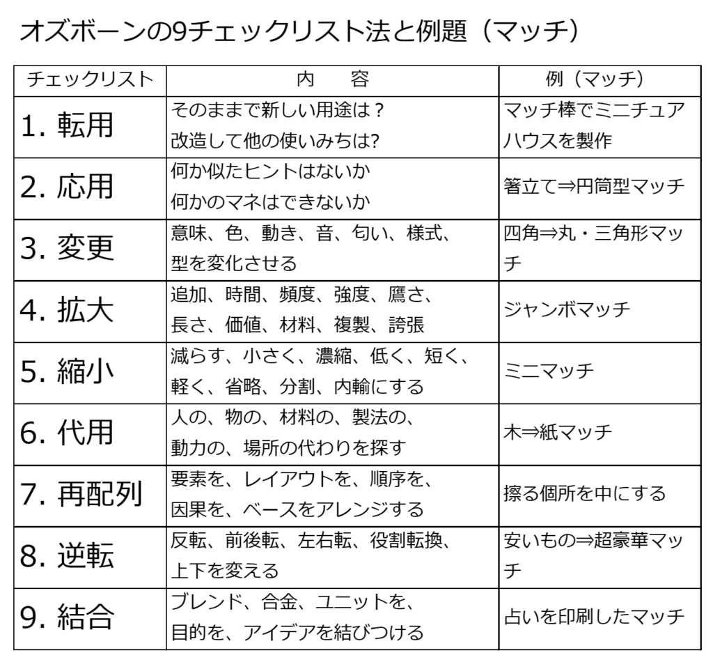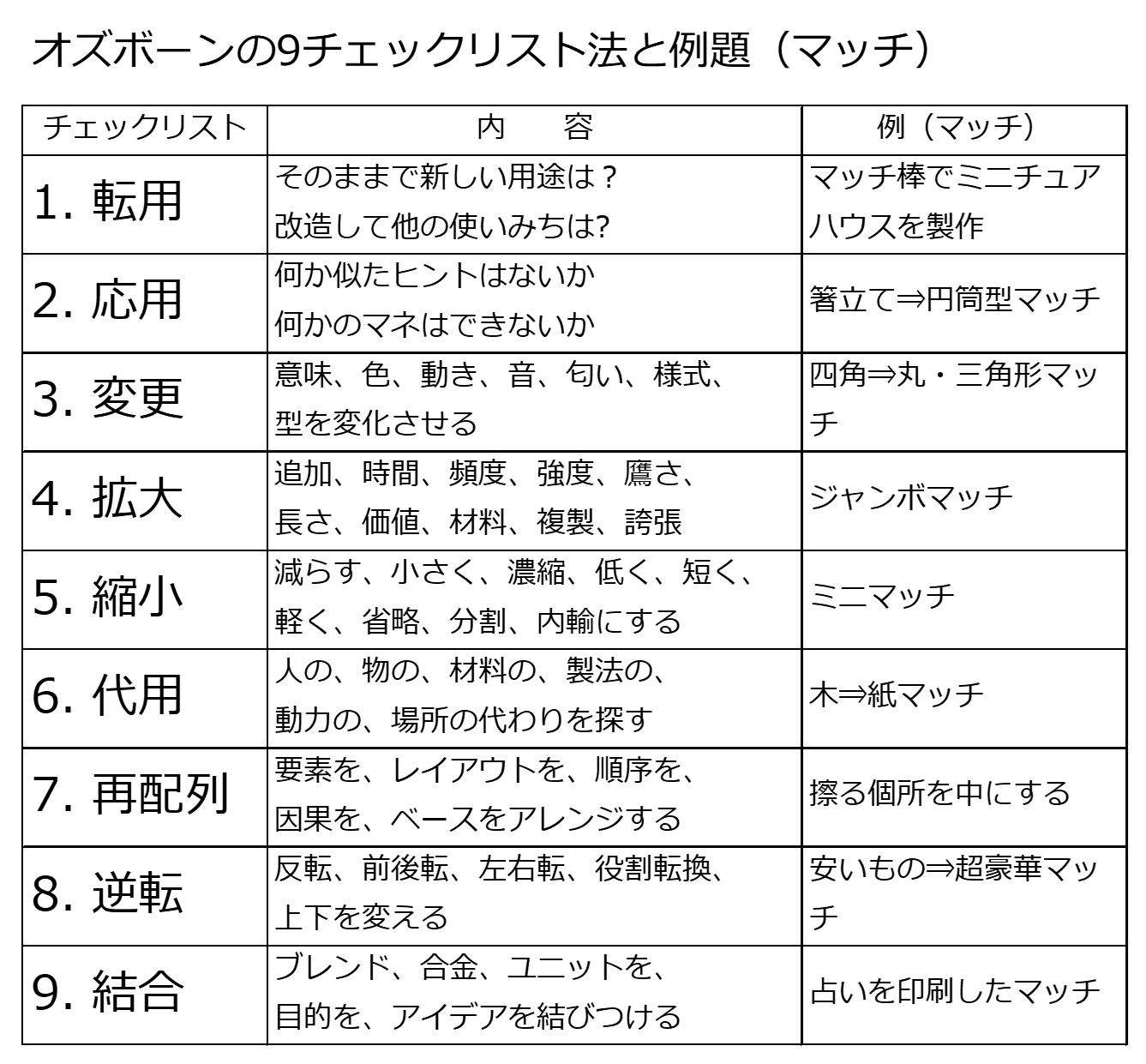 ④態度技法:問題解決そのものに焦点をあてるのではなく、主に創造的態度を身に付けるための技法