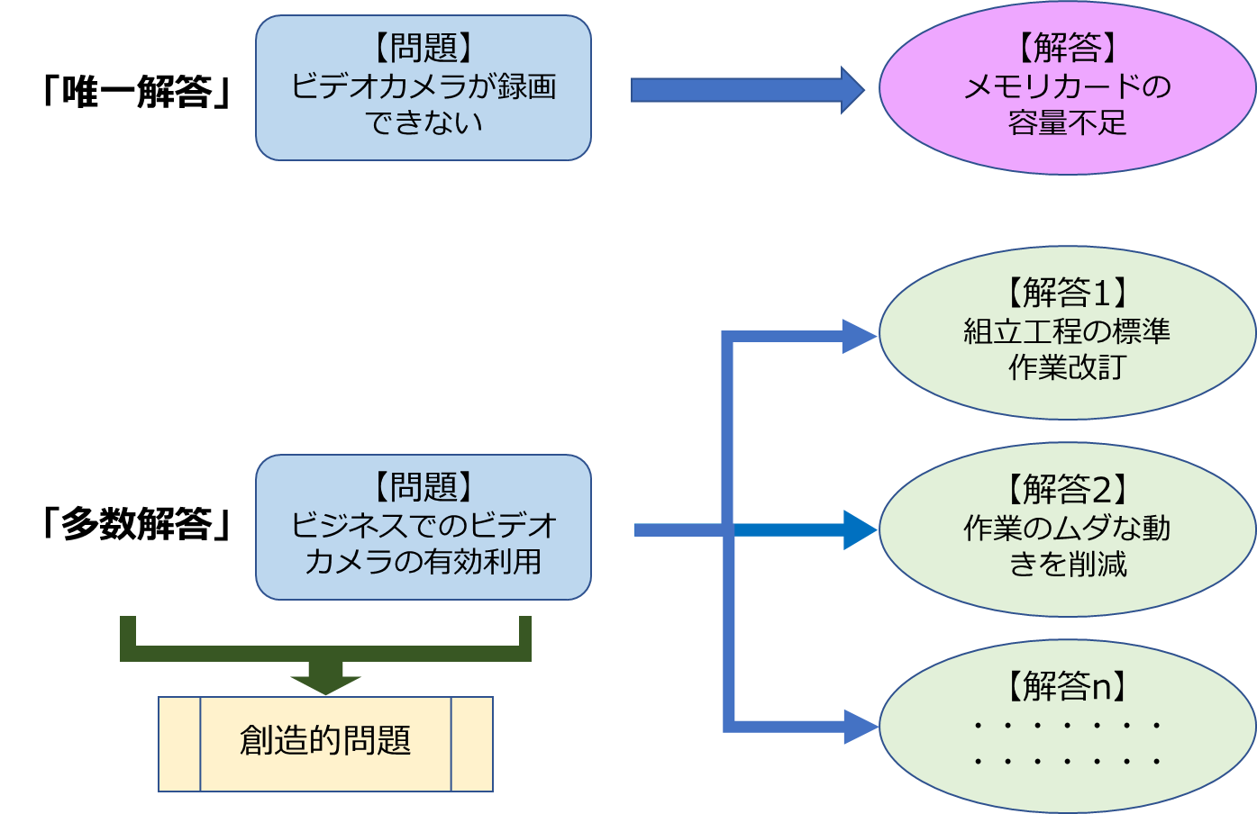 一方、「ビジネスでのビデオの有効利用法」ならば、例えば、「組立工程の標準作業を改訂する」や、「作業のムダな動きを削減する」など、その回答はいろいろあるので、「多数解答」の問題になります。