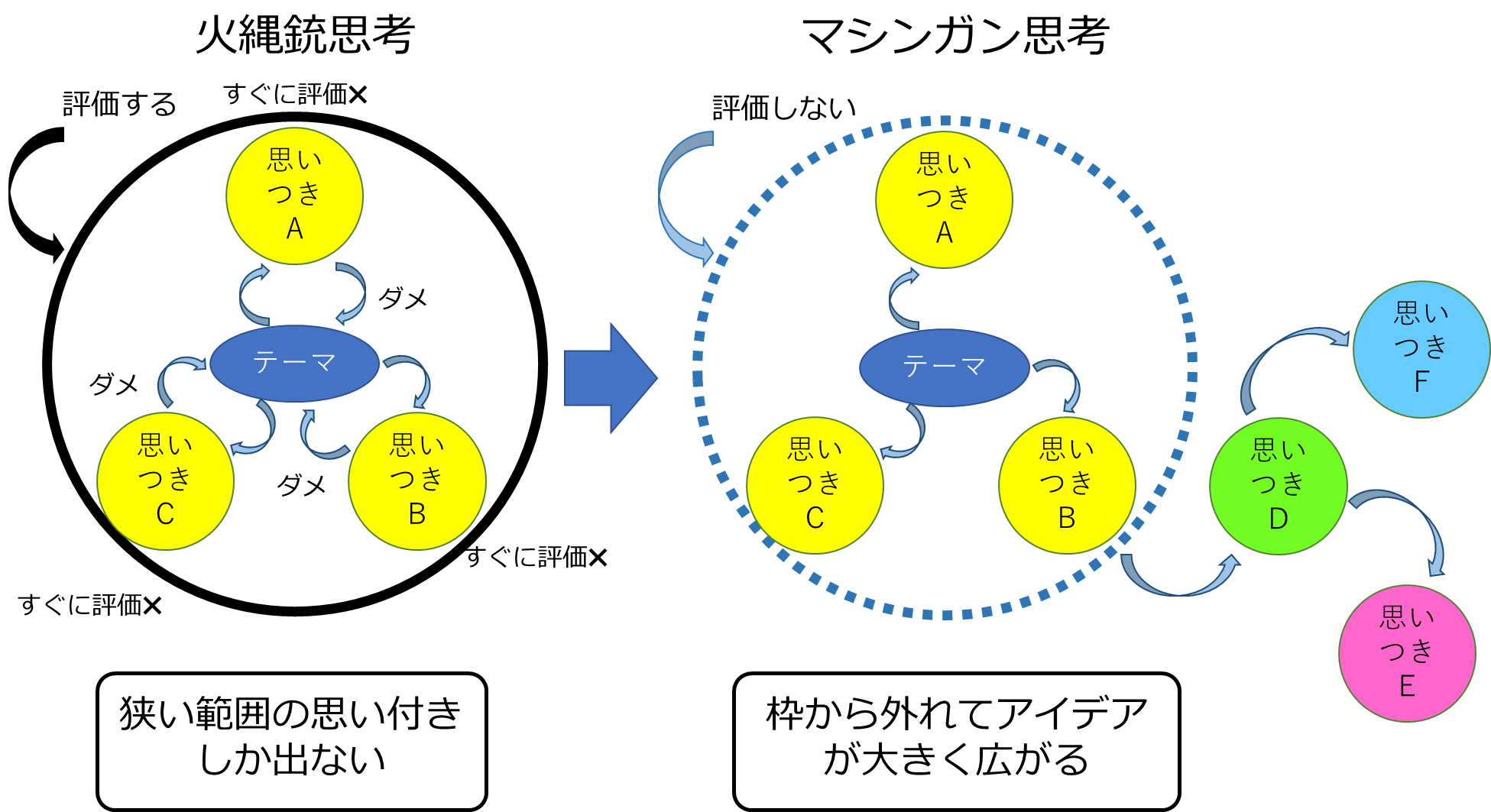 発散思考のときは、マシンガンのように思いつきをドンドン出す「マシンガン思考」をして、評価は後回しにします(図9 )。そうすれば宴会を「屋形船で」、「公園で」など面白いアイデアが続々出るでしょう。発想のときは発想に徹するべきです。