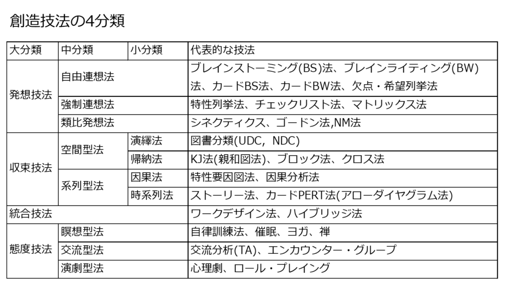 表10 に、創造技法の4分類と代表的な技法とを示しています。