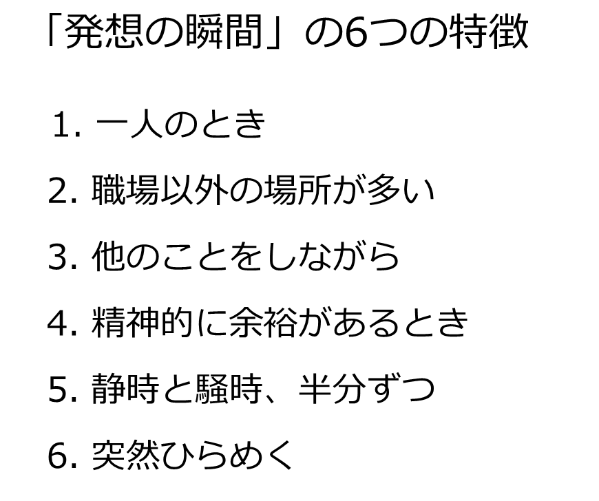 先程の、「現代人の発想パターン調査」によると、「アイデアが生まれるとき」のベスト3は、「夕方から夜」42%、「寝入りばな」37%、「深夜」29%で、発想の瞬間は圧倒的に「夜」でした。
