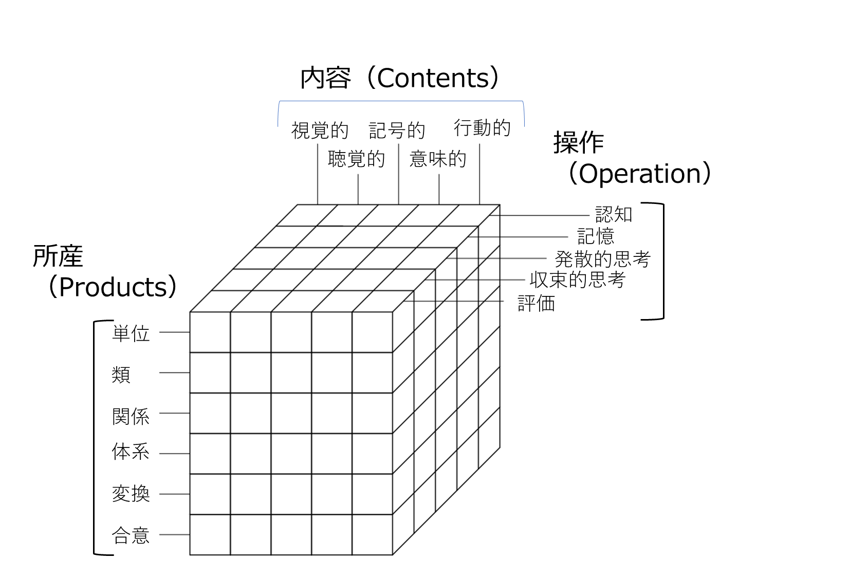 頭脳モデルの「内容」には、視覚的、聴覚的、行動的なものなどが含まれます。これらの情報内容を「操作」した結果、「所産」つまりプロダクツが生まれます。例えば、情報と情報との関係から単位、類、体系などや、情報を他の情報に変換して新たなものを生み出したりします。