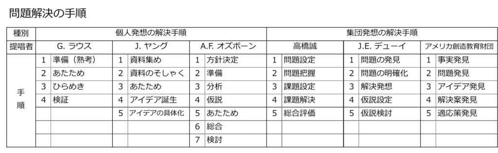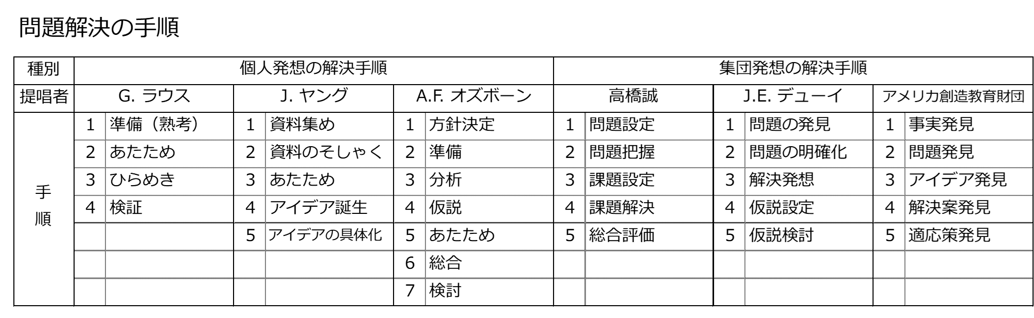 そして、個人発想では「発想」に重点が置かれますが、集団発想では「問題解決の流れ」が中心になります。本項では、個人発想では「ワラスの4段階説」を、集団発想では「高橋式の 5段階説」を紹介します。