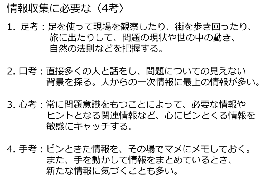すなわち、足を使って実際の現場の生情報を集め(足考)、口を使って人から話を聞き出し(口考)、心を使ってピンとくる重要データやヒントをキャッチし(心考)、手を使ってさまざまな情報やヒント、思いつきをメモする(手考)という情報収集のための努力が、創造型人間には欠かせません。