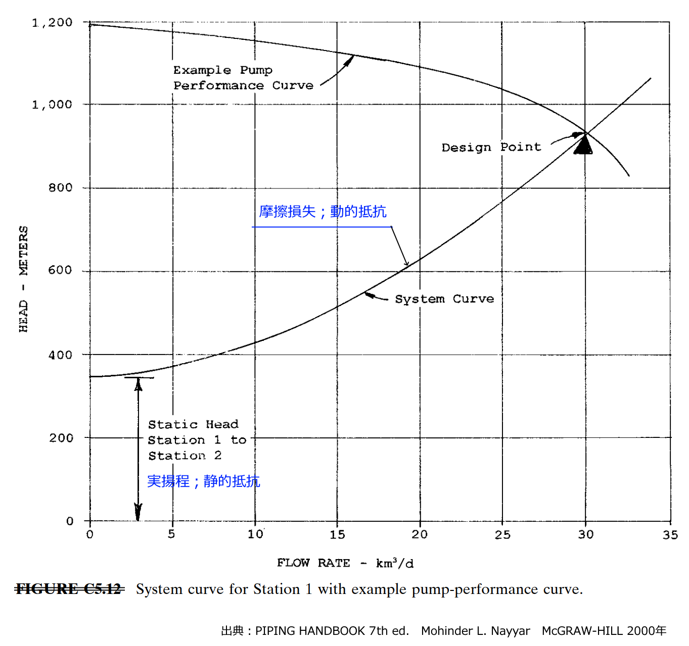 図 管路抵抗曲線の要素 出典:PIPING HANDBOOK 7th ed. Mohinder L. Nayyar McGRAW-HILL 2000年