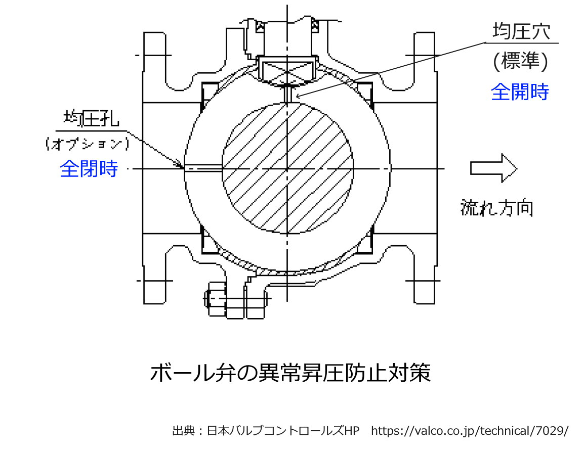 図 ボール弁の異常昇圧防止対策 出典:日本バルブコントロールズHP https://valco.co.jp/technical/7029/