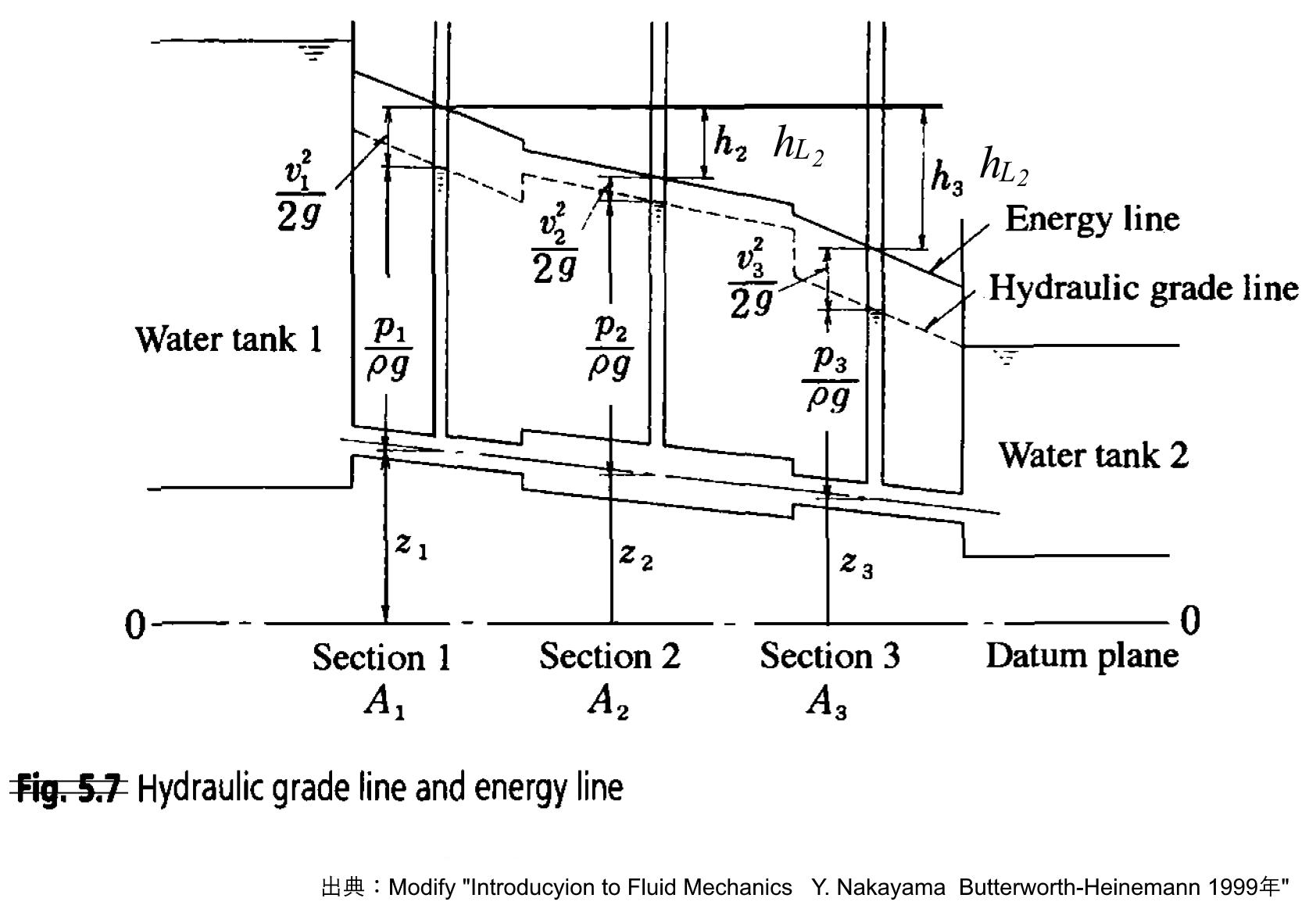 図 ベルヌーイの式についての説明 出典:Modify “Introducyion to Fluid Mechanics Y. Nakayama Butterworth-Heinemann 1999年”