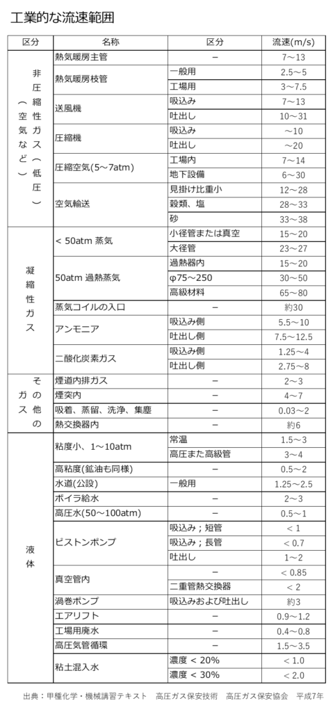 図 工業的な流速範囲 出典:甲種化学・機械講習テキスト 高圧ガス保安技術 高圧ガス保安協会 平成7年