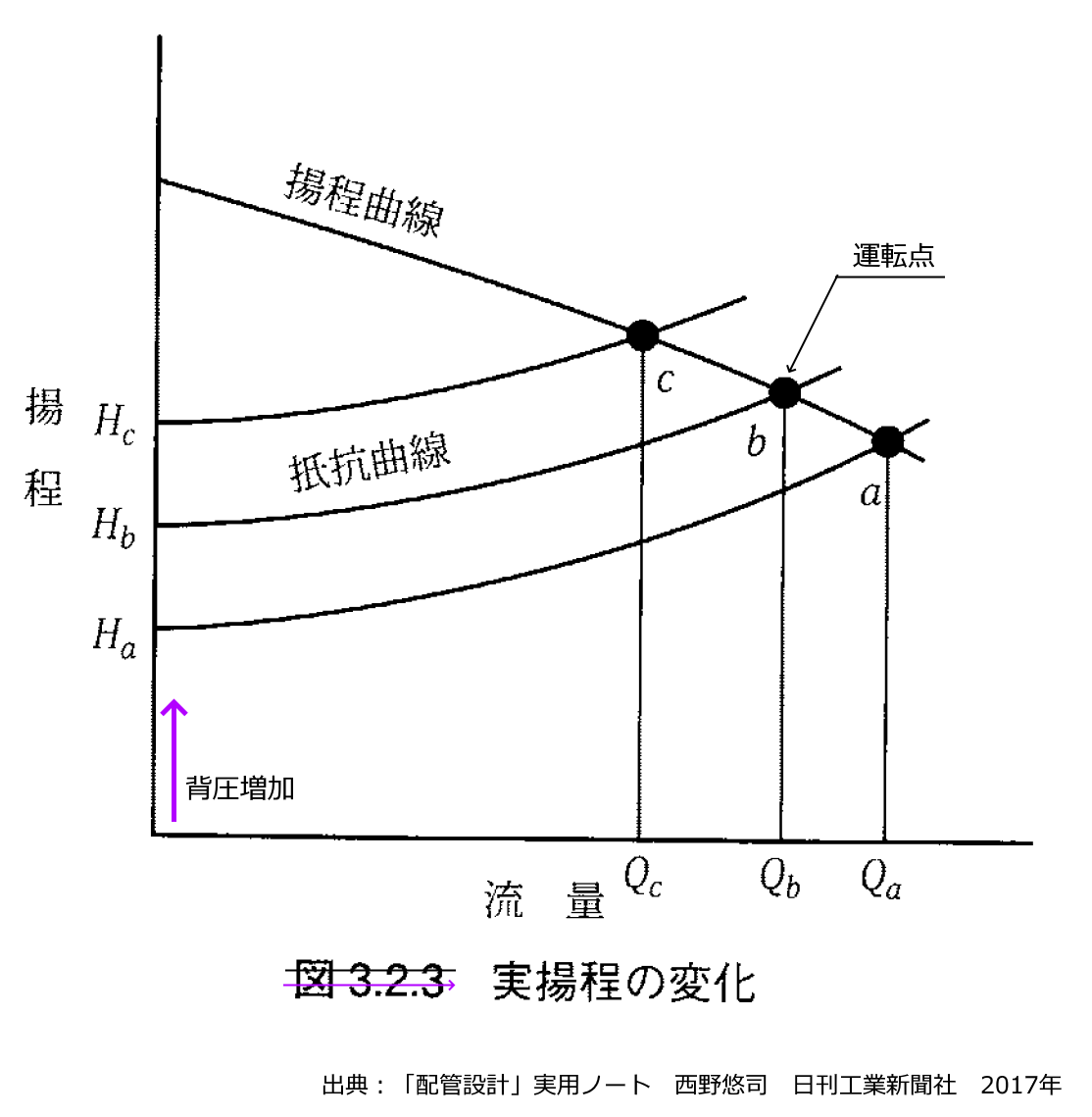 図 背圧の変化による実揚程の変化 出典:「配管設計」実用ノート 西野悠司 日刊工業新聞社 2017年