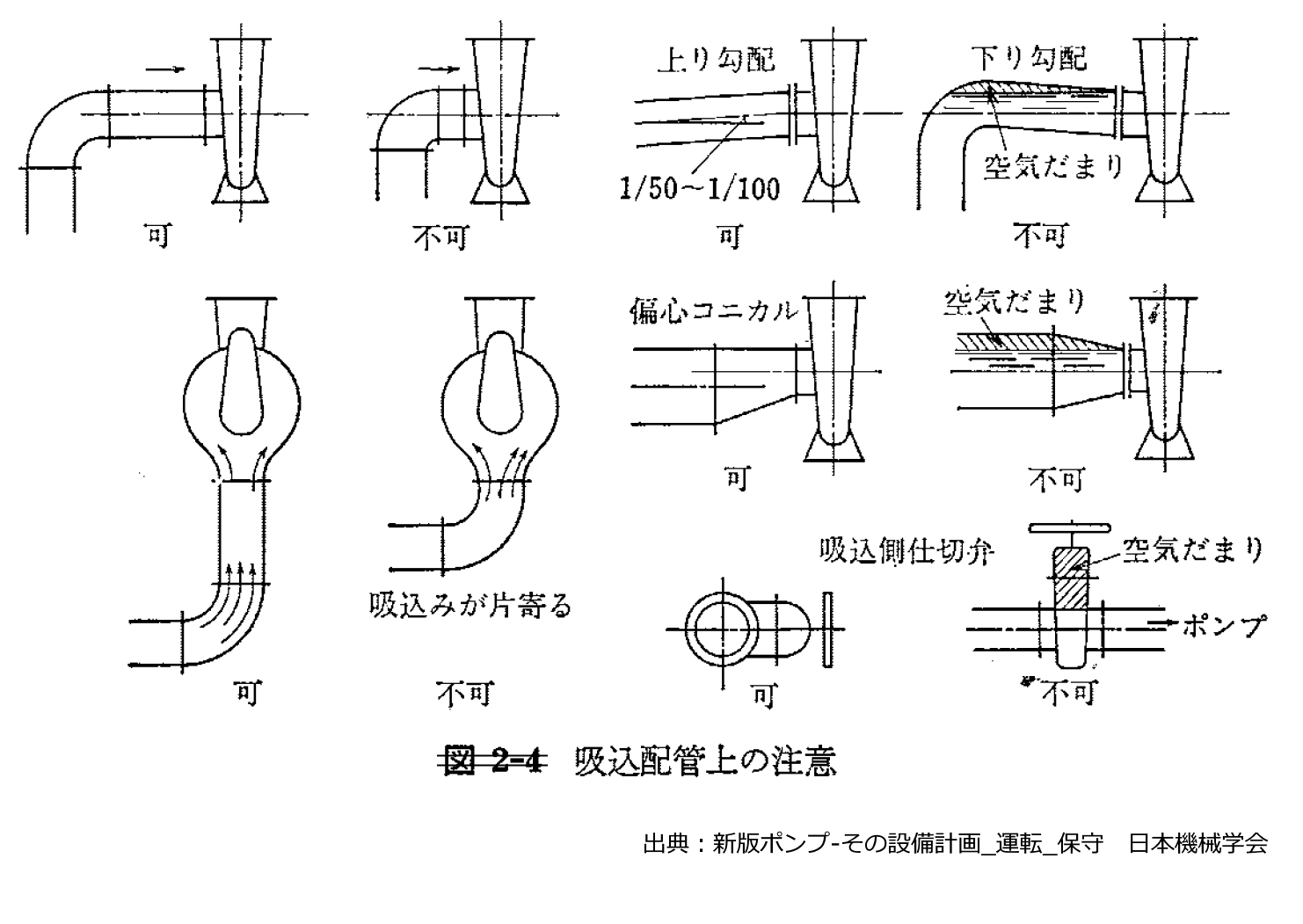 図 ポンプ吸込み配管の設計上の注意 出典:新版ポンプ-その設備計画_運転_保守 日本機械学会