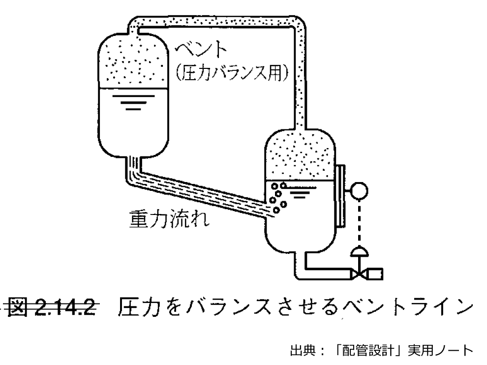 液位の異なる2つのドラム間を重力流れで液体輸送する場合、下流ドラムに気相が溜まり圧力が上がると、気相が管路を上流ドラムへ逆流し、不安定な流れとなります。これを防止するため、上流ドラムと下流ドラムの圧力をバランスさせるベント管(均圧管)が必要です。これにより、ドレンの流れがベーパの逆流によって阻害され、断続的になる現象を防ぎます。