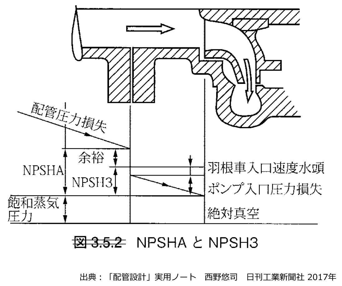 図 NPSHとNPSH3との関係 出典:「配管設計」実用ノート 西野悠司 日刊工業新聞社 2017年