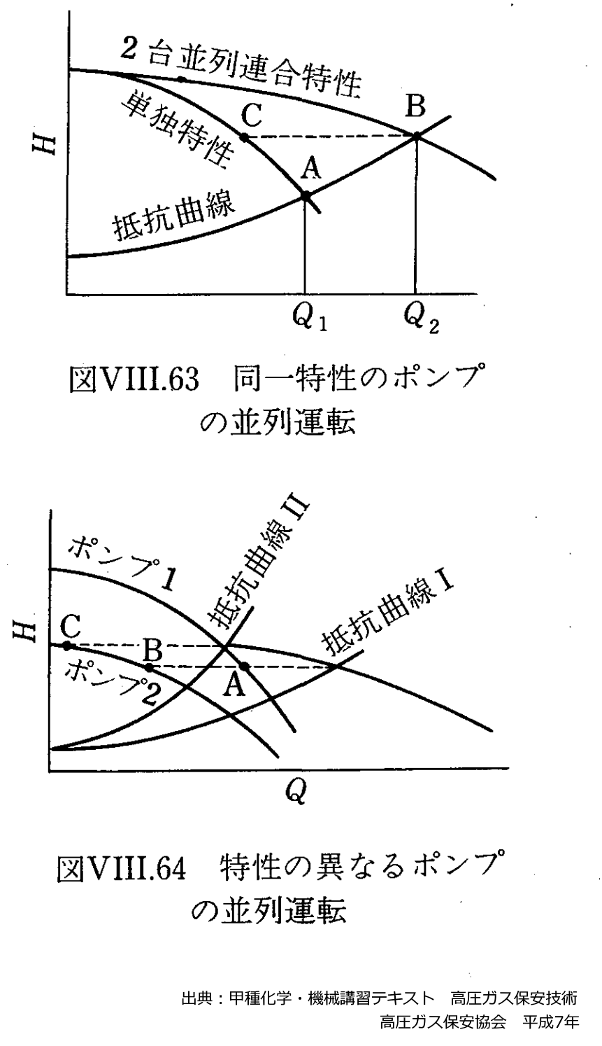 図 並列運転の特性 出典:甲種化学・機械講習テキスト 高圧ガス保安技術 高圧ガス保安協会 平成7年