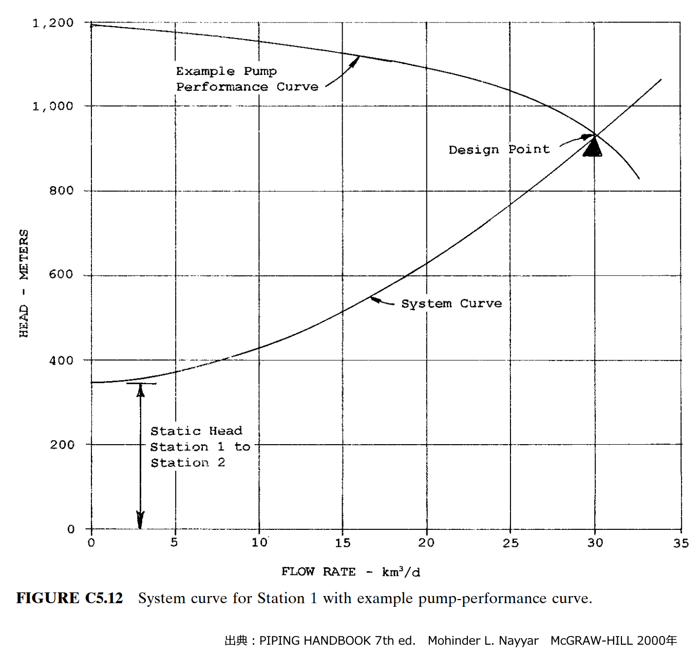図 管路抵抗曲線の例 出典:PIPING HANDBOOK 7th ed. Mohinder L. Nayyar McGRAW-HILL 2000年