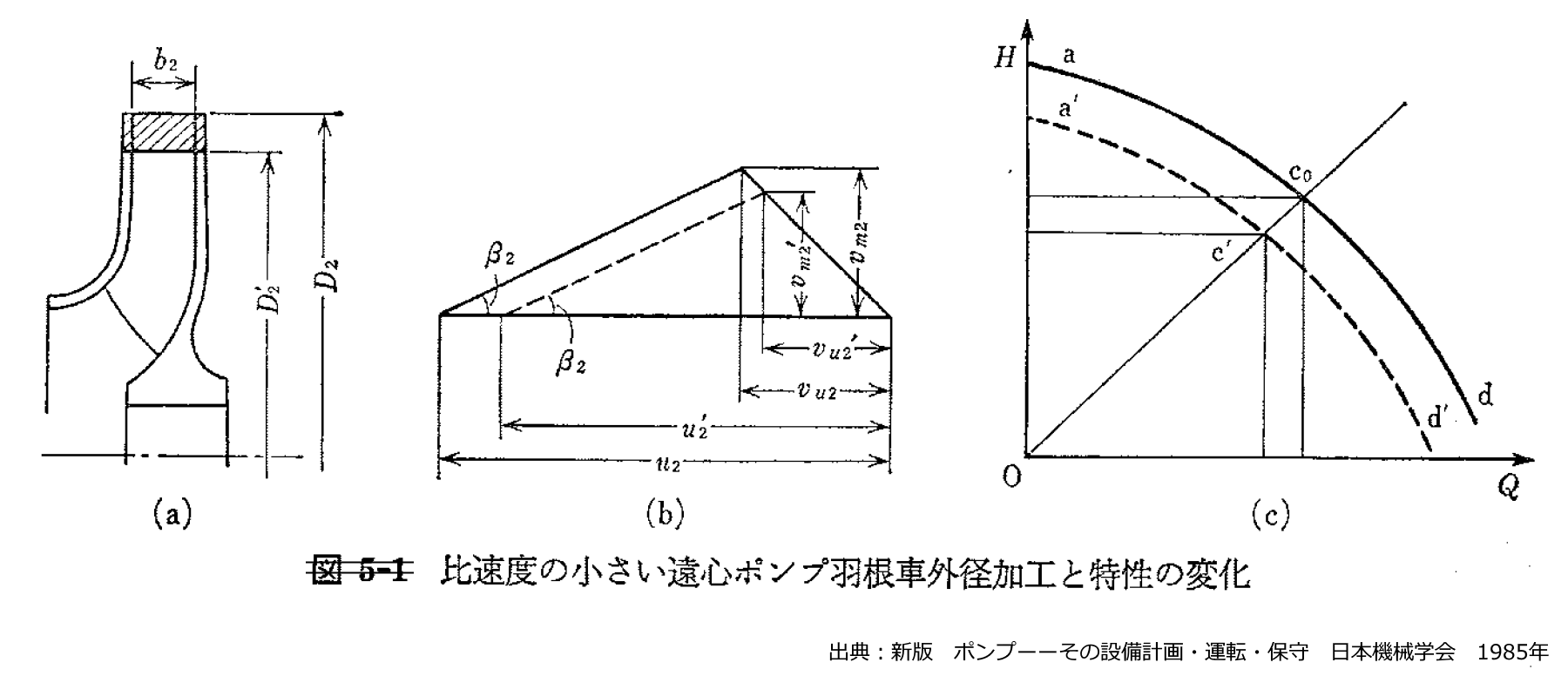 比速度の小さい遠心羽根車の外径 D2 を D2‘ まで減少させるとき、羽根出口角度 β2 および羽根車出口幅 b2 が加工前後でほとんど変わらなければ、羽根車出口での速度三角形は、図 に示すように加工前後で相似になります。したがって、羽根車出口での速度比はすべて D2’/D2 の比に等しくなります。加工前後での対応点は次式で表されます。