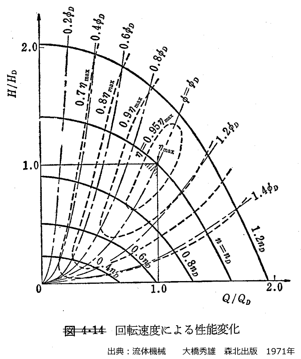 図 回転数変化による性能の変化 出典:流体機械 大橋秀雄 森北出版 1971年