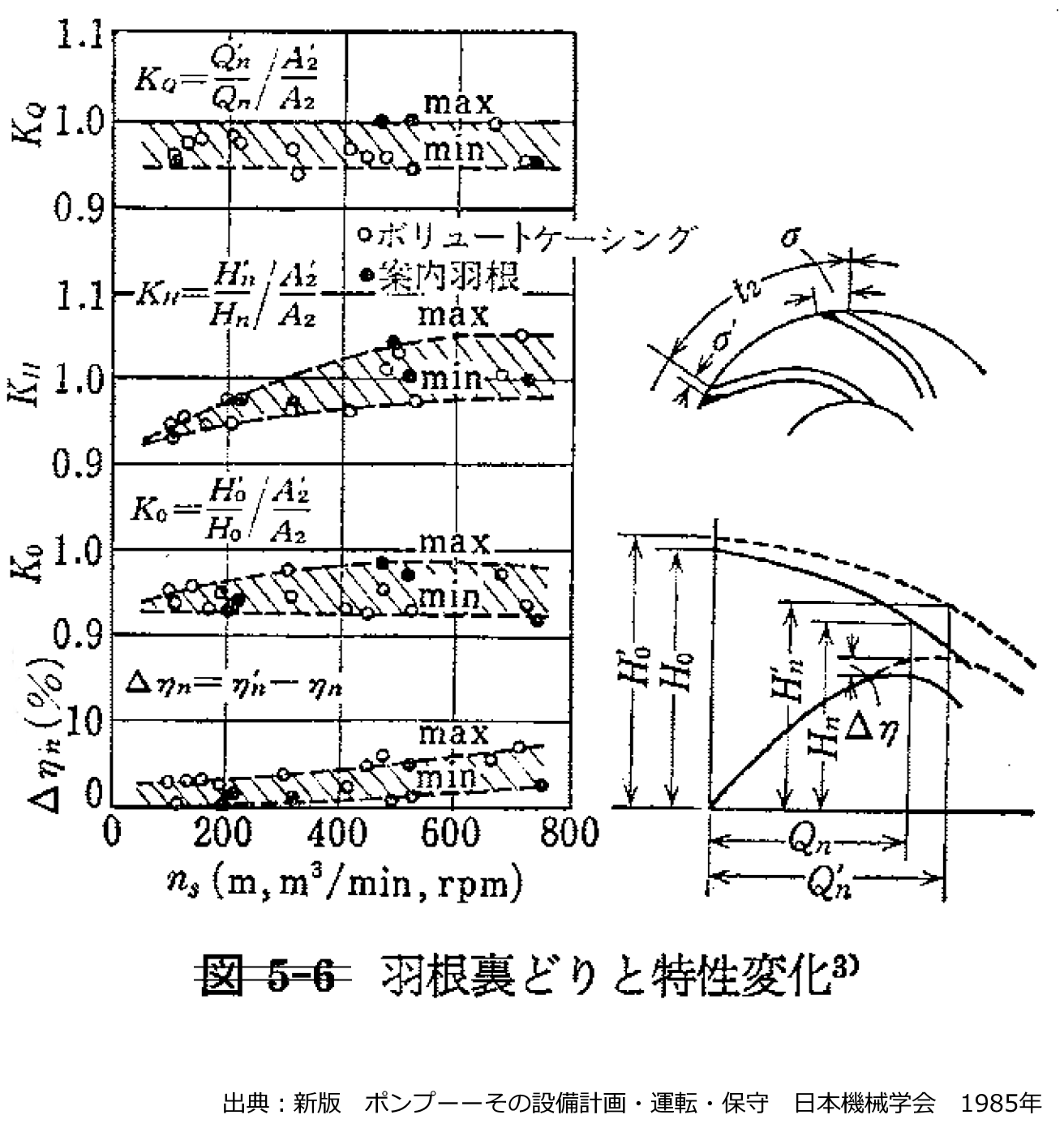 図 羽根の裏取り加工による比速度をパラメータとした特性変化 出典:新版 ポンプーその設備計画・運転・保守 日本機械学会 1985年