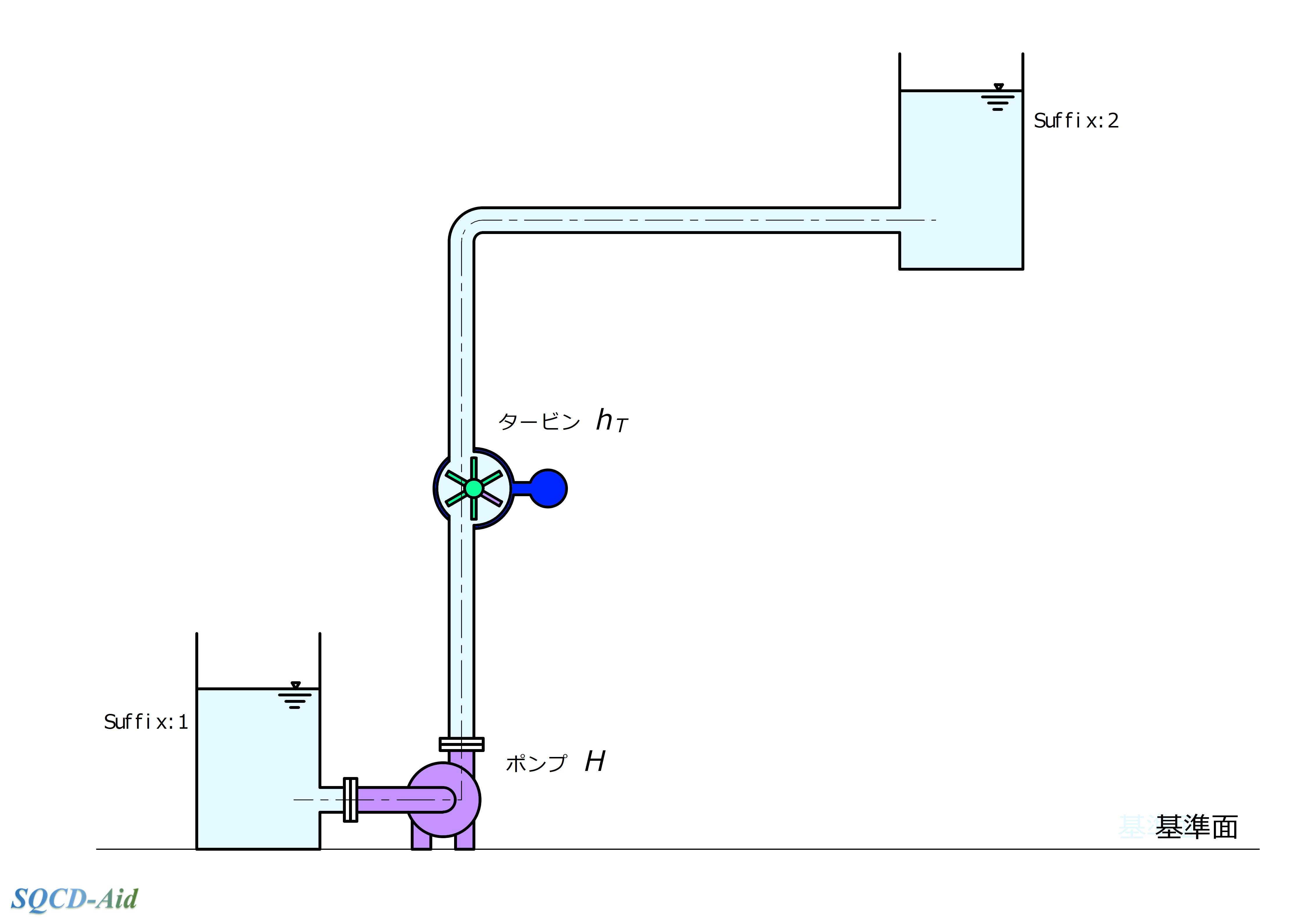 \( h_{T} \): タービン(水車など)が流体から取り出す水頭(エネルギー水頭) [m]