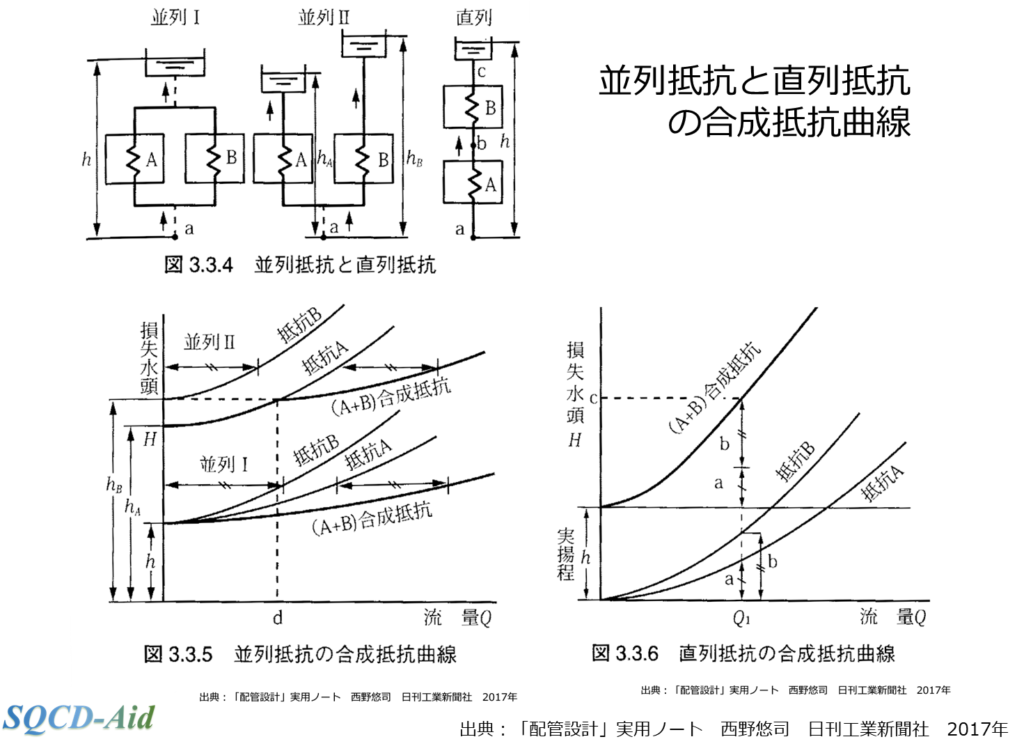 同一流量において、各抵抗(管路)の損失水頭を垂直方向に合算することで、合成抵抗曲線が得られます。