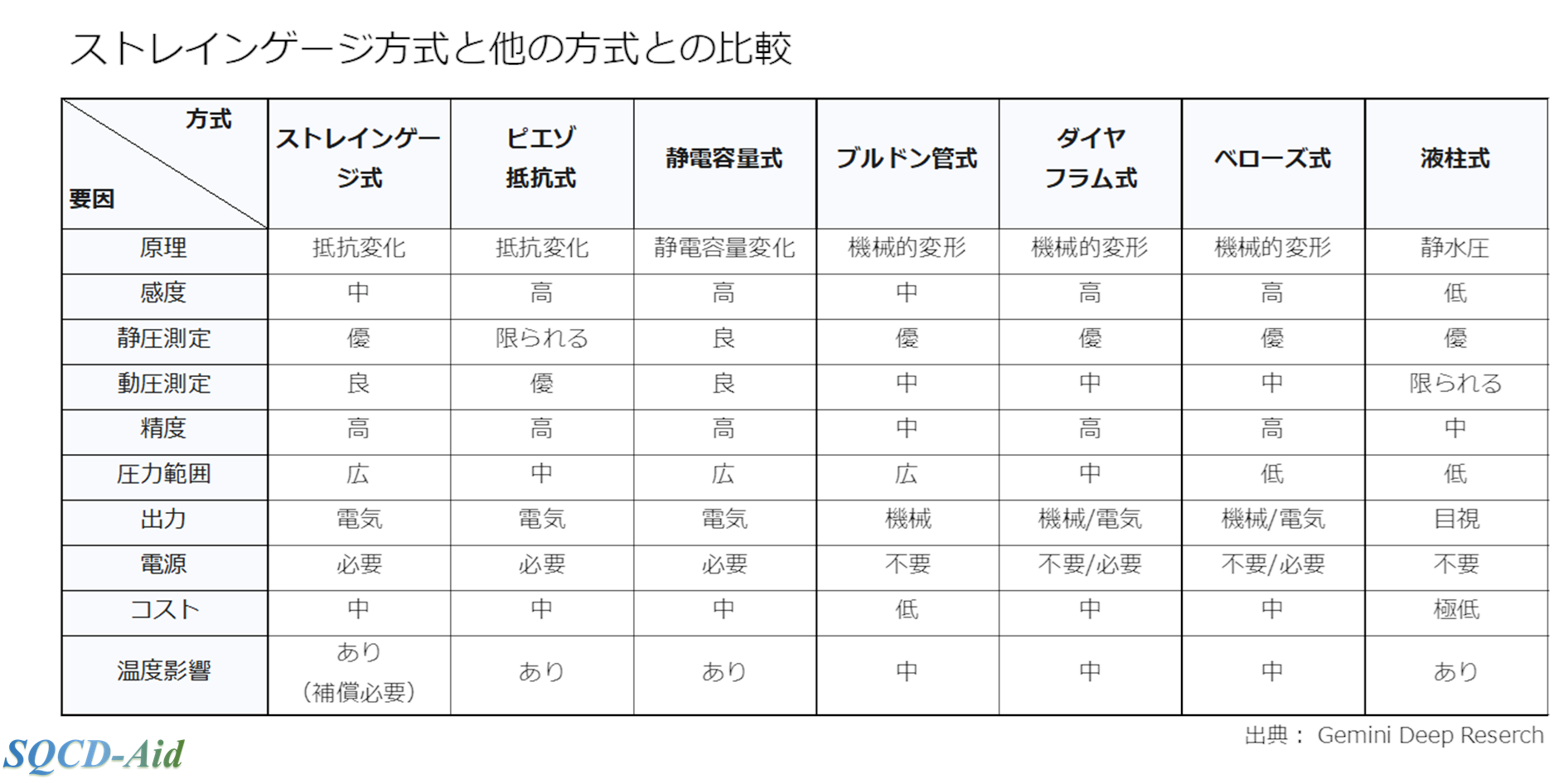表2 ストレインゲージ方式と他の方式との比較 出典:Gemini Deep Reserch