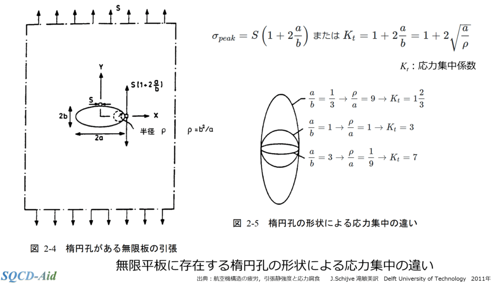 図 無限平板に存在する楕円孔の形状による応力集中の違い 出典:航空機構造の疲労,引張静強度と応力腐食