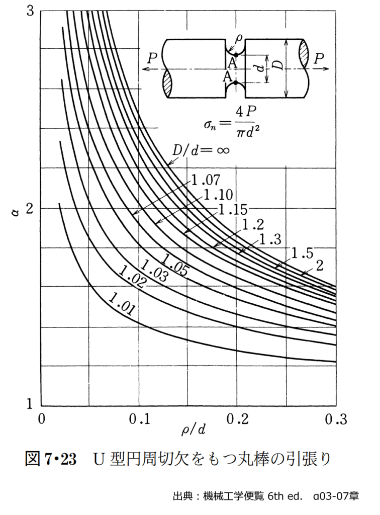 図 引張丸棒の応力集中 出典:機械工学便覧 6th ed. α03-07章