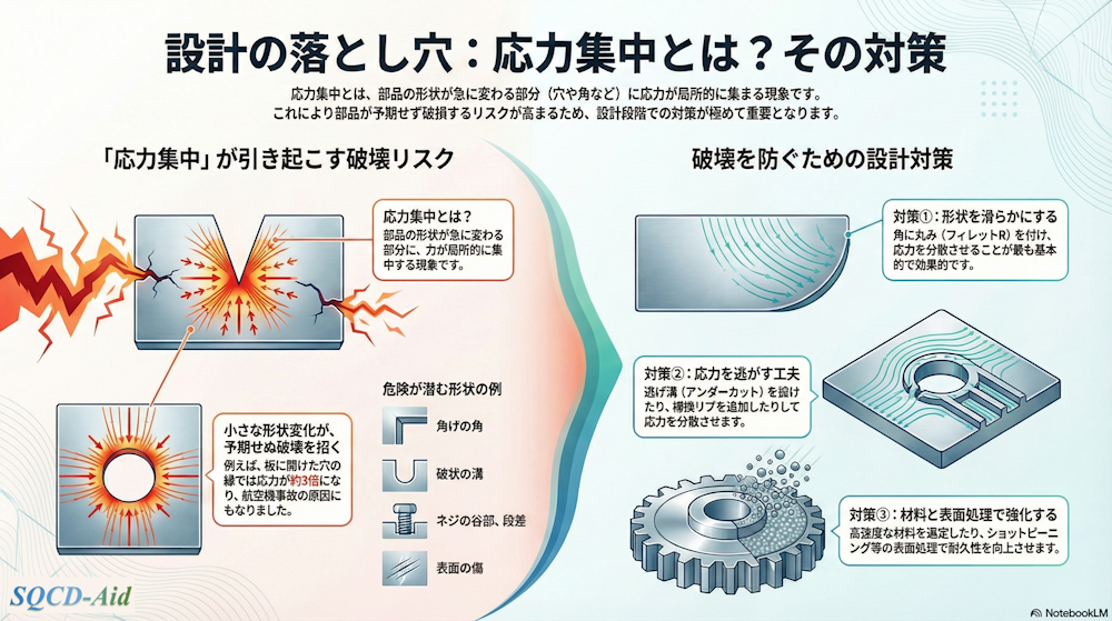 突起や穴、鋭角部では応力が局所的に集中し、その結果として破損や疲労破壊のリスクが高まります。したがって、設計段階からこれらの箇所を把握し、形状を滑らかにするフィレット付与や適材の選択、表面処理など適切な対策を講じることが極めて重要です。