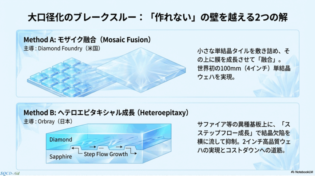 ダイヤモンド半導体の最大の障壁は「大口径・高品質・低コスト」なウェハ供給でした。現在、この壁を崩すための3つの主要技術が確立されつつあります。