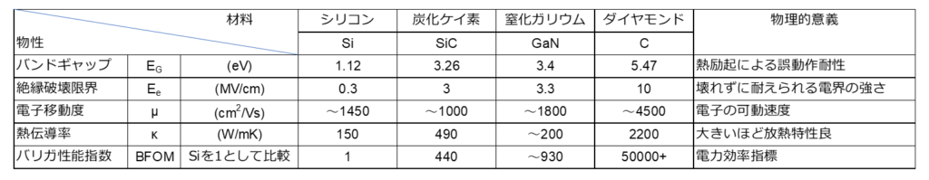 表 主要パワーデバイスの各種パラメータ 出典:半導体キャリアラボhttps://semicon-career-lab.com/semiconductor-03/