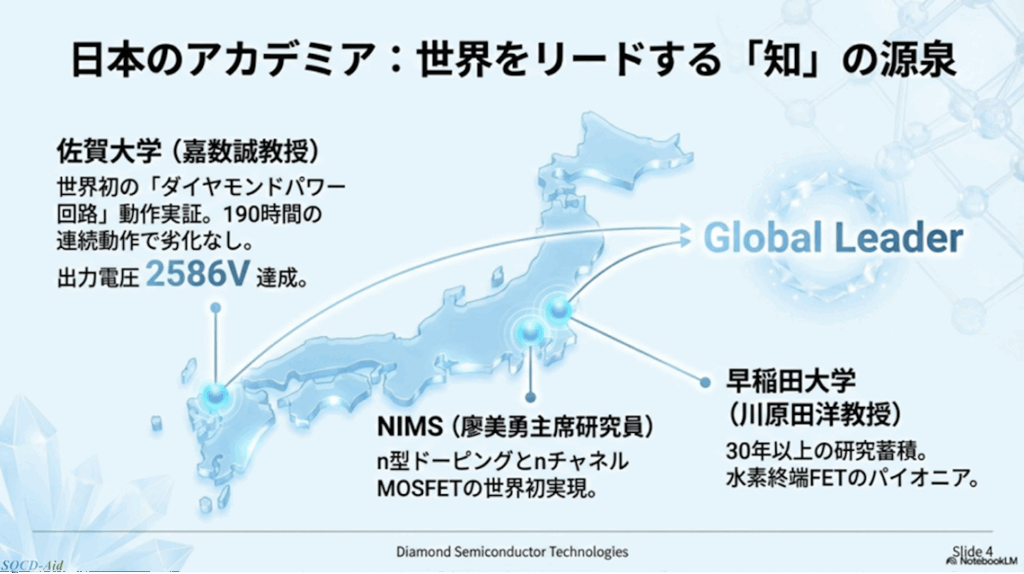 佐賀大学(嘉数教授)の世界最高出力実証、NIMSのnチャネルMOSFET開発、大熊ダイヤモンドデバイスによる量産工場建設など、研究・製造の両面で世界トップクラスの「縦串」を保有しています。