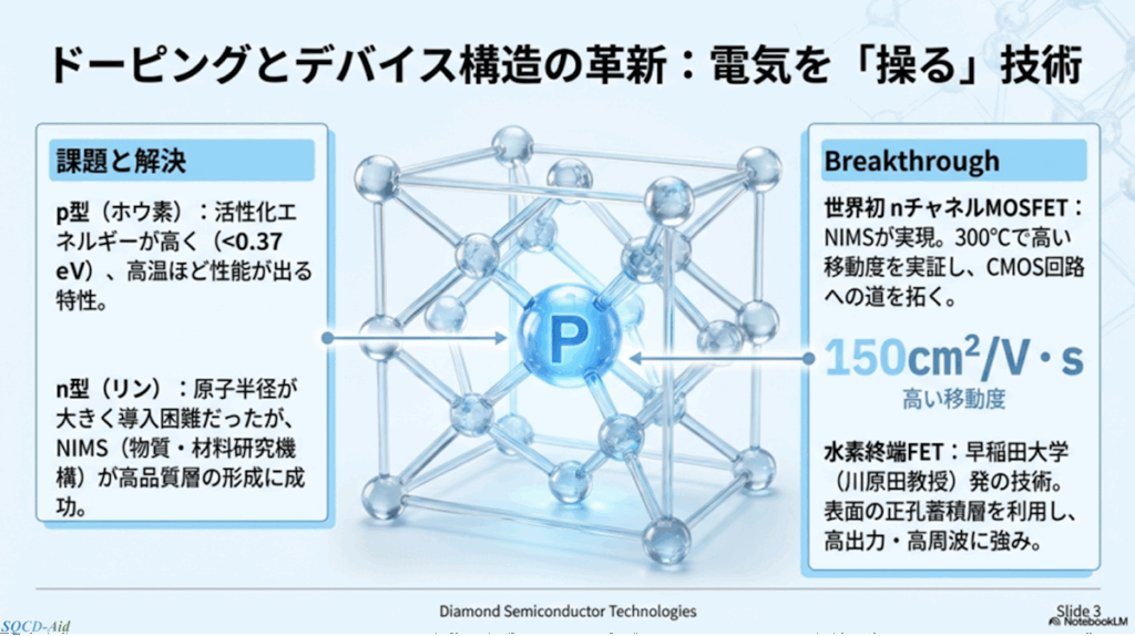 ・ n型: リン(P)のドープ。ボロン以上に難易度が高く、NIMS(物質・材料研究機構)が成功した高度なプロセス技術が不可欠です。