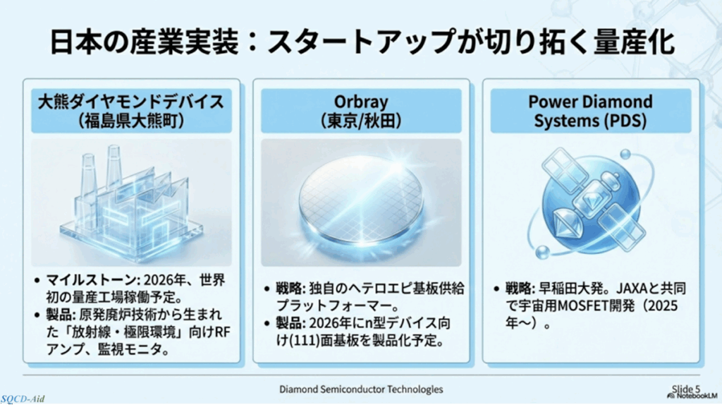 ・ 大熊ダイヤモンドデバイス: 福島県大熊町に世界初の量産工場を建設中で、2026年の稼働を予定。放射線耐性を活かした原発監視用センサーやRFアンプを開発しています。