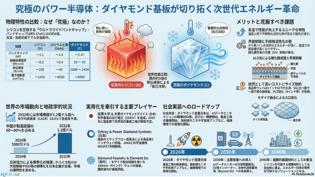 現代のパワーエレクトロニクスは、シリコン(Si)からシリコンカーバイド(SiC)、窒化ガリウム(GaN)へとシフトしてきましたが、これらワイドバンドギャップ(WBG)材料をもってしても、次世代の超高出力・極限環境要求(EVの800Vシステム超、AIデータセンターのMW級電力、宇宙探査)には限界が見え始めています。
