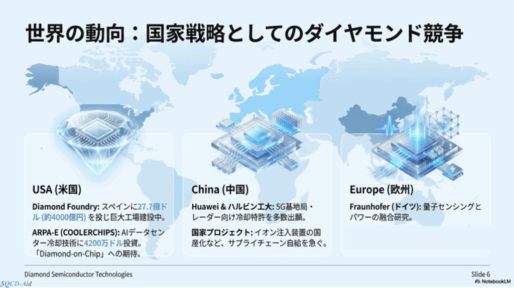 ・ 米国(DARPA/ARPA-E): 通信デバイスの熱問題を解決する「GaN-on-diamond」技術や、AIデータセンターの冷却エネルギー削減を目的とした「Diamond-on-Chip」技術に巨額を投じています。